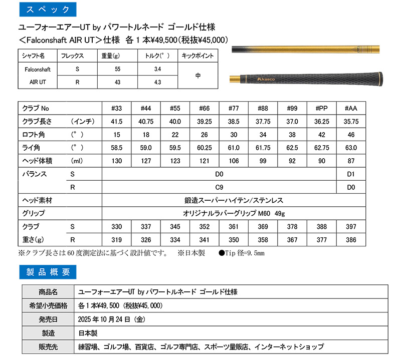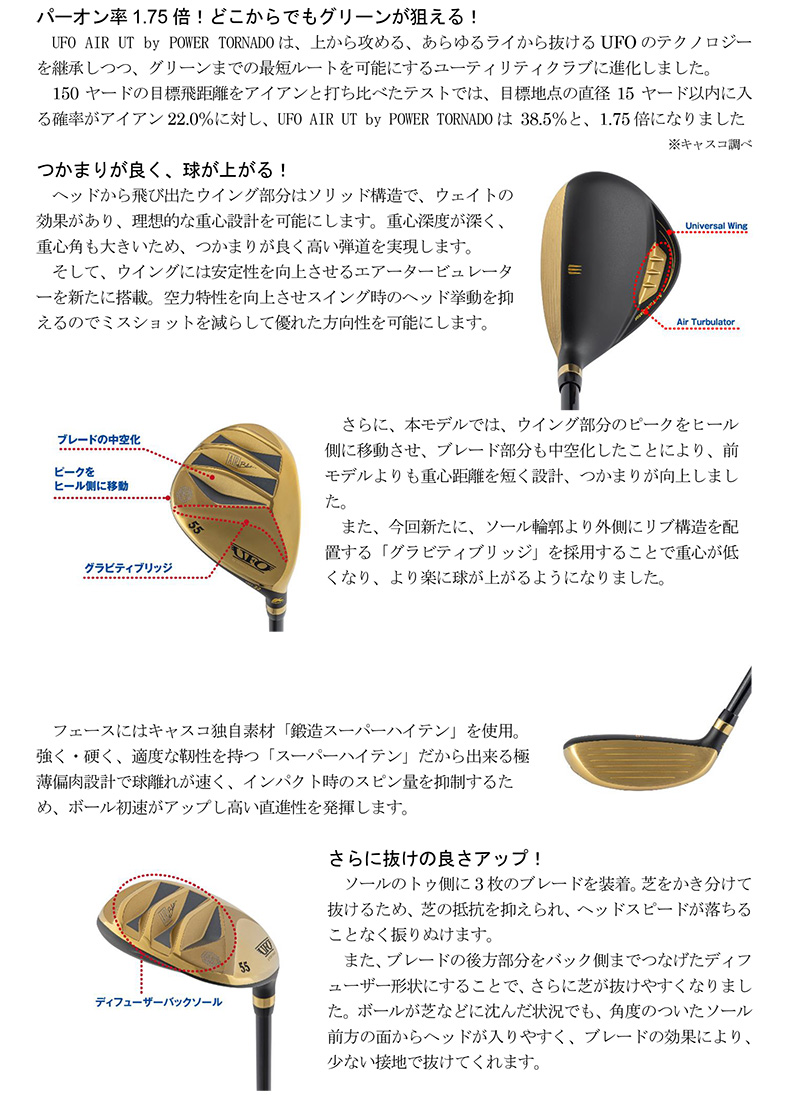 ゴルフ用品総合メーカーのキャスコ株式会社(東京都新宿区 代表取締役社長:阿部二幸)は、どこからでもグリーンを狙えるユーティリティクラブ「UFO AIR UT by POWER TORNADO」にゴールドに輝く数量限定モデル「UFO AIR UT by POWER TORNADOゴールド仕様」を2025年10月24日(金)より新発売いたします。