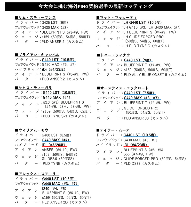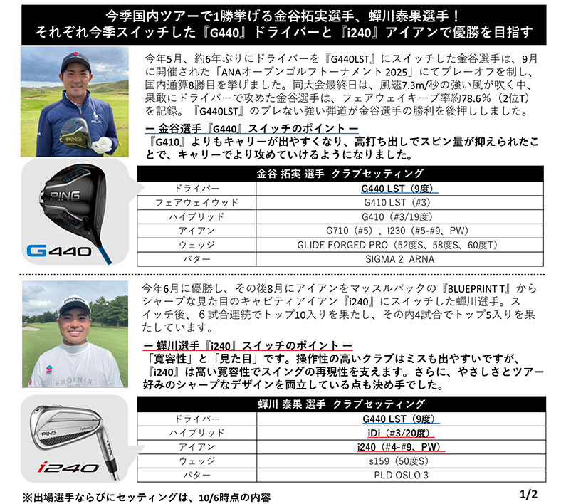 PINGでは、10月9日(木)~12日(日)に横浜カントリークラブで開催される、アジアで唯一のPGAツアー公式戦「BaycurrentClassic Presented by LEXUS」に、契約選手11名が出場予定です。注目は、『G440』ドライバーにスイッチし先月今季初勝利を挙げた金谷拓実選手と、6月に今季初勝利を飾り、8月に新製品『i240』アイアンへスイッチした?川泰果選手です。自然の起伏を活かした戦略性の高いコース設計と、世界基準のコンディションを誇る名門・横浜カントリークラブで、選手たちの技術とクラブ性能の両方が試されます。PING契約選手たちの勝負の一打を支える『G440』と『i240』の実戦パフォーマンスに、ぜひご注目ください。