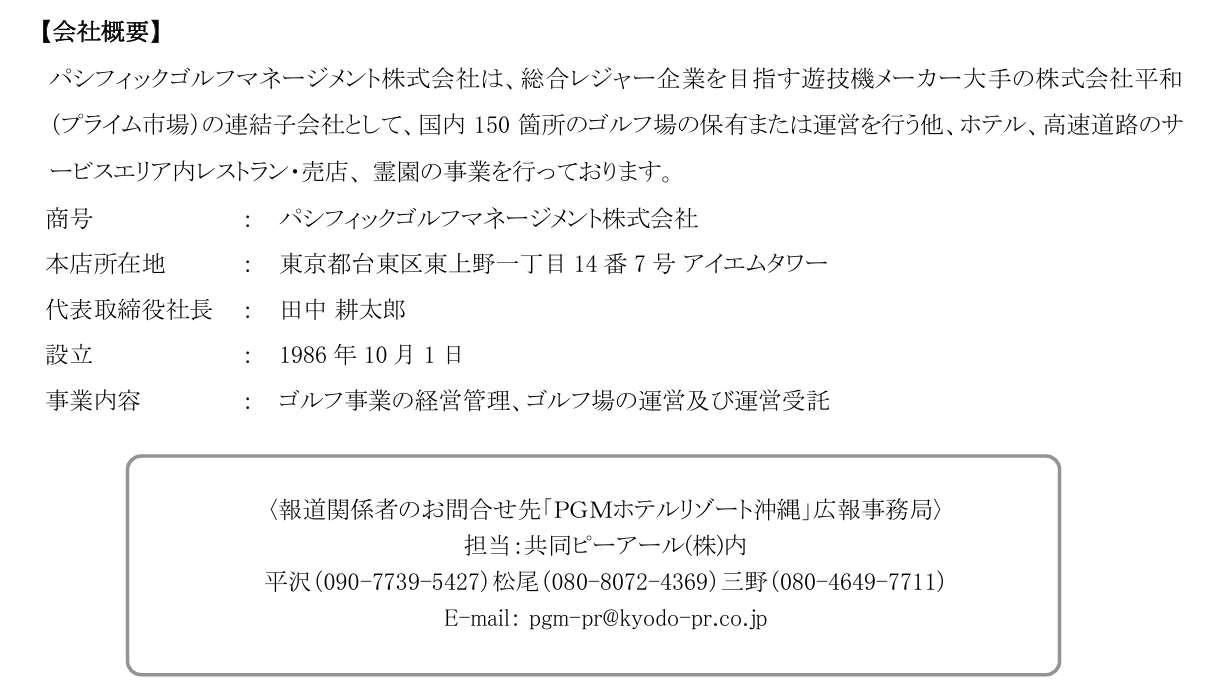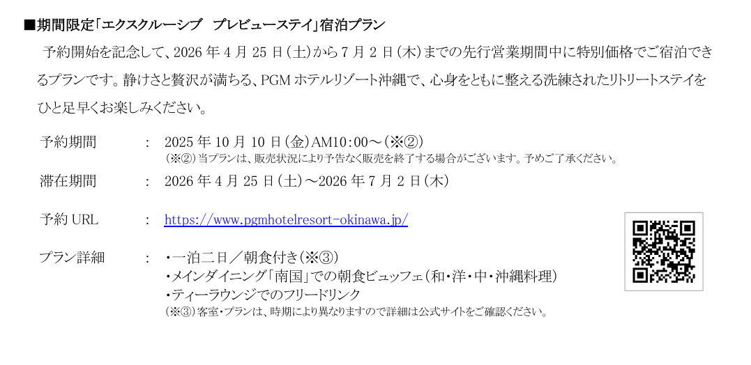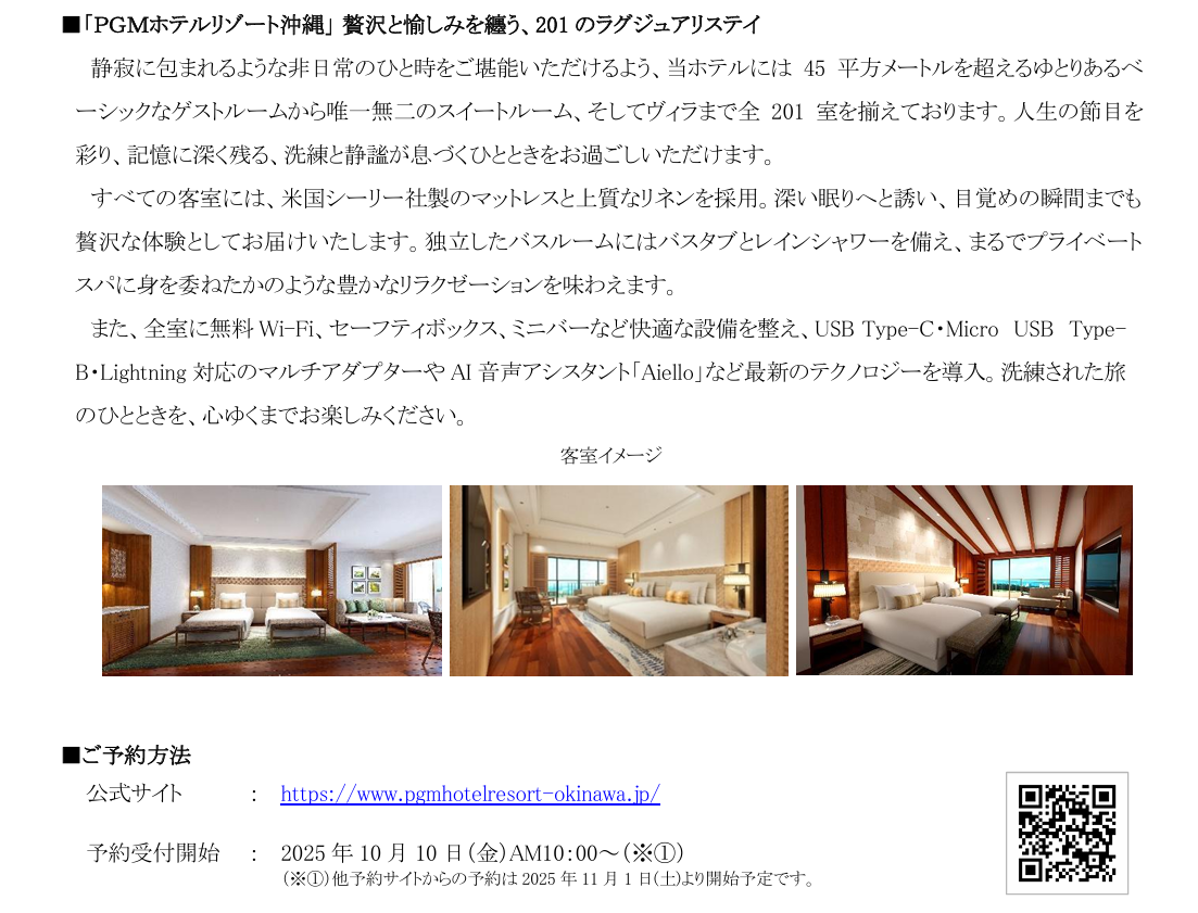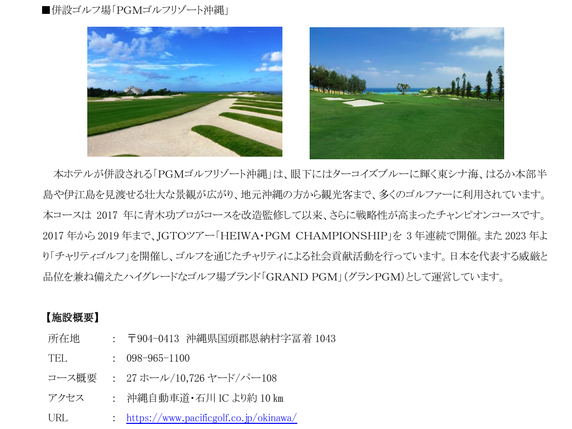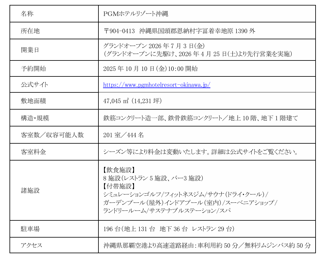 パシフィックゴルフマネージメント株式会社(本社:東京都台東区東上野/代表取締役社長 田中 耕太郎、以下「PGM」)は、2026年7月3日(金)にグランドオープン、4月25日(土)より先行営業を実施するPGM初のラグジュアリリゾートホテル「PGMホテルリゾート沖縄」の予約受付を2025年10月10日(金)より公式サイトにて開始いたします。