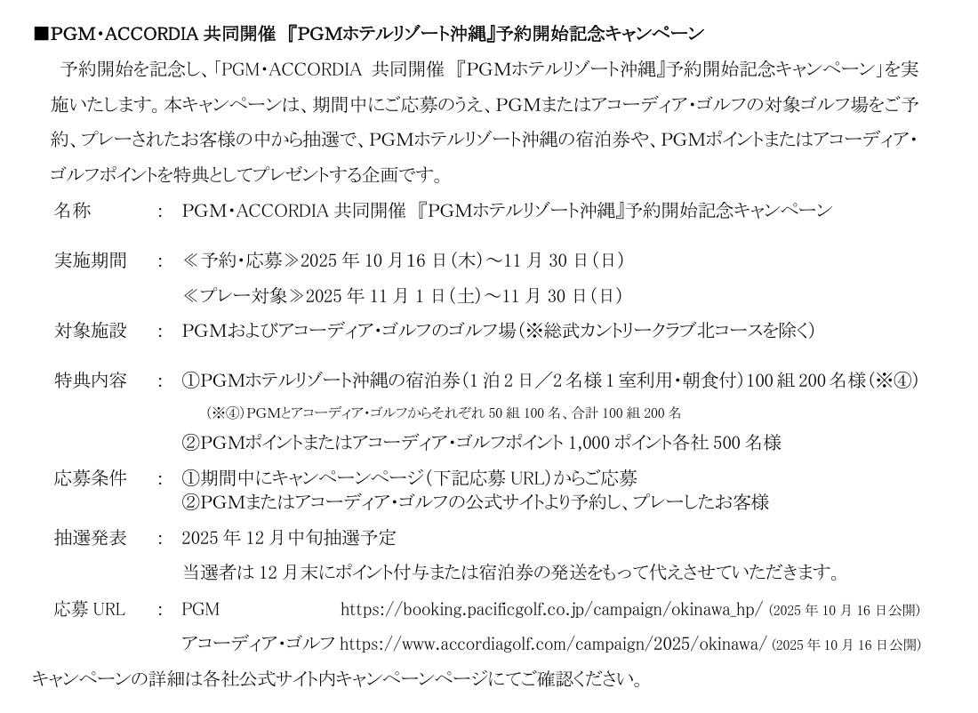 更に、予約開始を記念して、「PGM・ACCORDIA共同開催 『PGMホテルリゾート沖縄』予約開始記念キャンペーン」を2025年10月16日(木)より実施いたします。